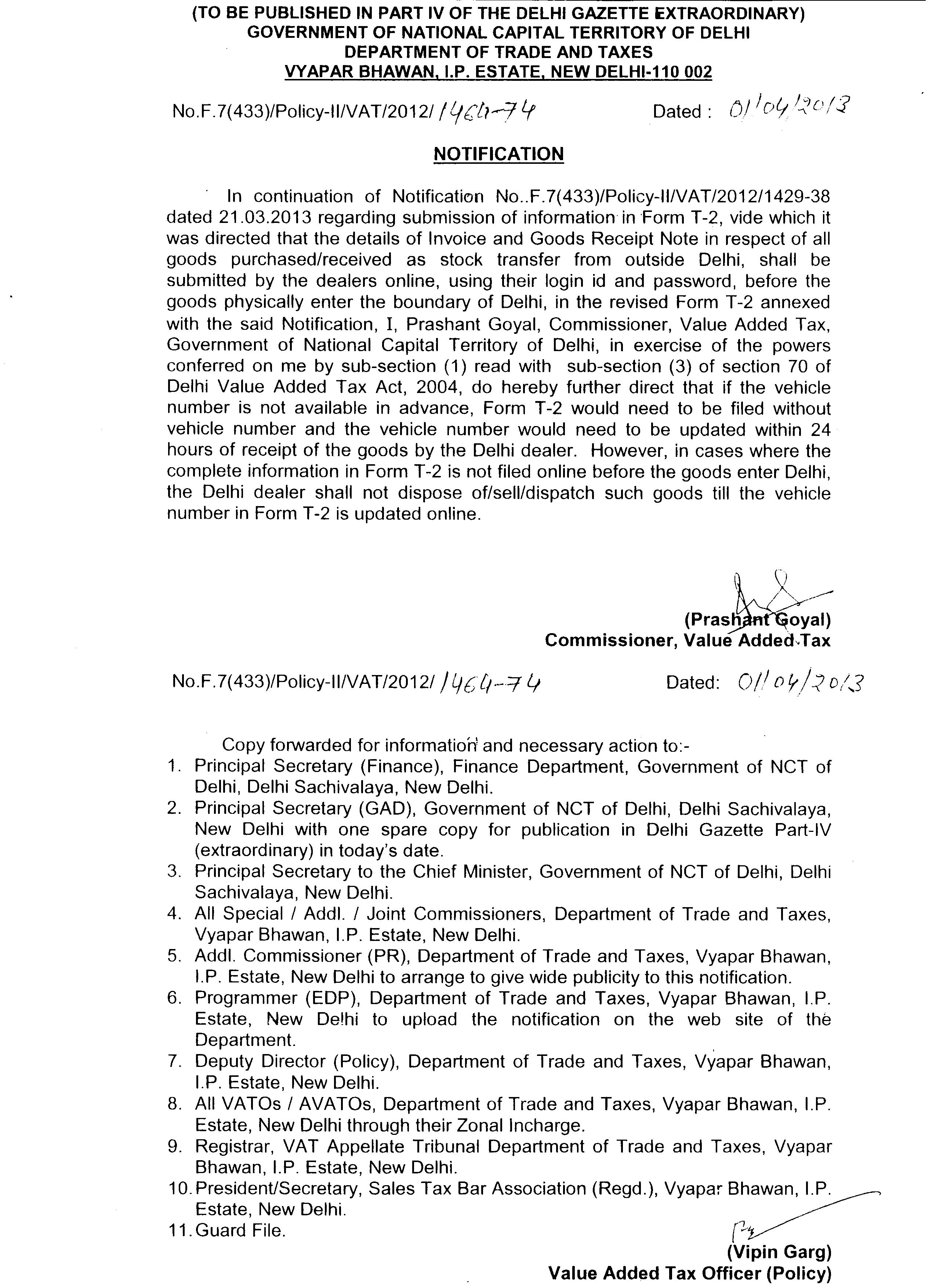 goods physically enter the boundary of Delhi, in the revised Form T-2.